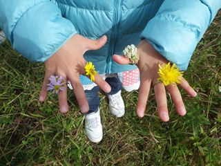 【左】伝蔵池での観察の様子 【右】指にタンポポの“金の指輪”をつけてちょっと嬉しい