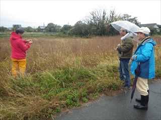 ならば4人で観察会。予定コース2時間をショートカット版にして、新池、旧名古屋市野外教育センターのフェンス沿い、途中で田を横切って水路沿いに元の駐車場へ。