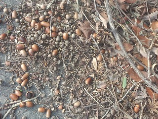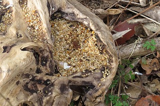 【左】携帯電話で撮影できたヤマガラ     【中】鳥り寄せに与えてあるキビやアワ     【右】コナラ。獣や鳥のえさになる