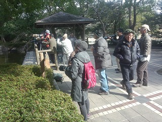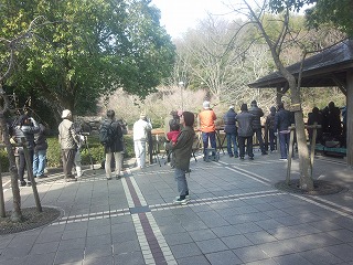 最初の観察は公園の入口にある池で行いました。鳥の撮影マニアが高級カメラでカワセミを狙っていました。カワセミも人馴れしているのか設置された止まり木に来てポーズをとっていました。桜にはエサ台が設けられヤマガラがすぐ近くまで来てエサを食べていました。時には手の上にエサを置けば食べに来るそうです。