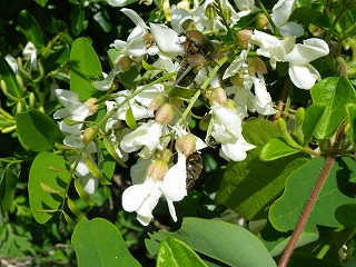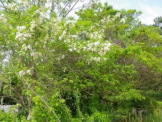【左】ミツバチの蜜源「ニセアカシア」開花中   【中】クロマツとツツジ開花中   【右】トベラ開花中、クズ繁茂