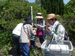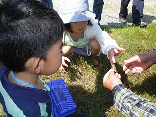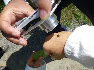 開花中の花の周囲で次々に小さな昆虫を見つけては歓声を上げ、参加した子ども達に興味を持たせるよう見せたり触らせたりできました。