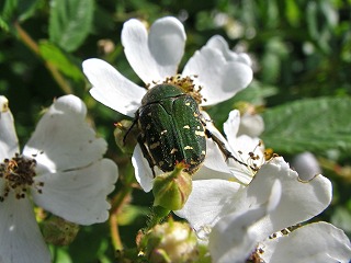 【左】ノイバラとコアオハナムグリ   【中】フジの花にもハナムグリが沢山集まっていました   【右】トベラの花とクズの蔓草は虫たちの楽園