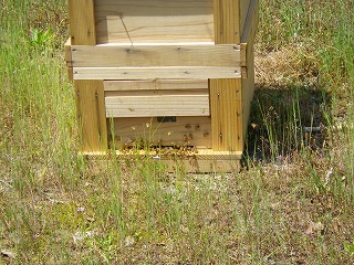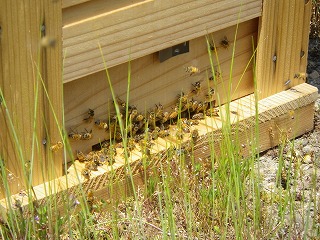 【左】セイヨウミツバチの養蜂箱   【中】   【右】出入り口のハタラキバチ(門番)