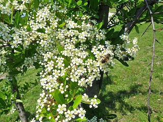 【左】   【中】ピラカンサ開花中   【右】ハナムグリ、ミツバチが訪花
