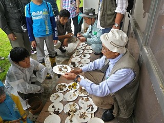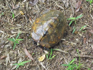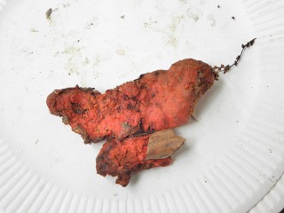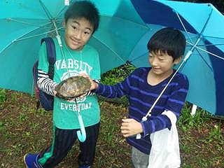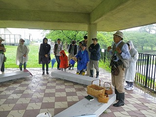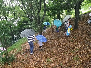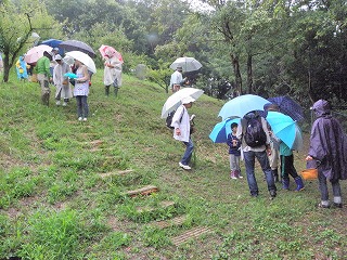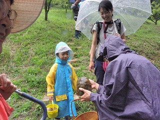 朝、曇り。集合場所へ着いたら雨。それでも参加者が集まり、小雨決行になった。挨拶のあと、キノコの基礎知識、採集の仕方などの説明後、林の中へ入った。 カッパを着て林の斜面を歩く、滑りやすくなっていたが、「あった!」「採れたー!」こども達は目ざとくと、籠に沢山採れたようだ。すぐに雨はやんだ。 土手の歩道横にシロマダラが死んでアリの巣に運ばれているかのように、体の半分が地面から出ていた。イシガメを捕まえた子もいた。