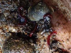 【左】生き物の解説          【中】ベンケイガニを持って得意顔         【右】シジミとユスリカ(アカムシ)
