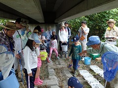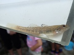 当日は青海市民センターに集合してから徒歩で下手橋まで移動し、橋の下の日陰で簡単なお約束をして川に入りました。それぞれ家族ごとに思い思いの場所でガサガサを行い、採集した獲物を橋の下に持ち寄り生き物の紹介と分かち合いを行いました。題名にあるメダカは確認できませんでしたが珍しいカワアナゴを確認することが出来ました。(記・降幡)