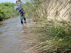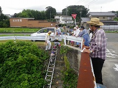 活動する場所は前山川の下手橋付近です。川に降りるのにクズ、アカメガシワススキ、チガヤが繁茂しているので事前に川に降りやすくするために事前に草刈りを行いました。 今年から堤防を降りやすくするように新兵器の折り畳み式の橋をを調達しました。