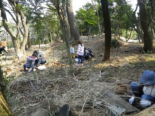 観察に先立ち、ムカデや成虫越冬中のスズメバチを直接手で触れないよう注意の後、早速朽ち木の中、落ち葉の下に潜む土壌動物(生物遺骸の解体者)探しに取り組みました。