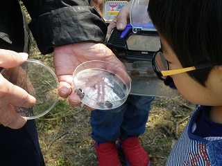 家族が取り集めた小動物は透明容器に入れた後、足の数で分類仕分けしました。1時間ほどしてから皆を集め、仕分けした結果を解説しました。