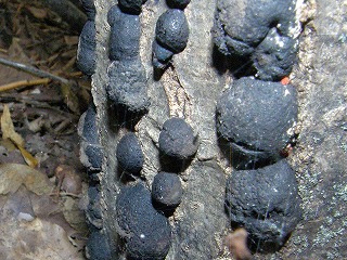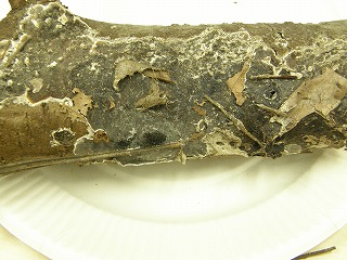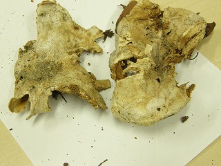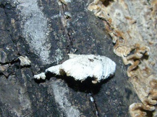 はじめに降幡さんがキノコの生態や観察するポイントについて説明をした。キノコのつくりについて、キノコを拡大した図で説明するので分かりやすく、参加者の小さい子までが、熱心に聞き入っていた。続いて課長さんから公園の諸注意についてお話があった。雨が降らないので、キノコが少ないのではないかと危惧していたが、キノコ探しに入ると、子供の目線は低く、意欲的に次々とキノコを見つけていた。親御さんも童心に返り熱心にキノコ探しをした。長さ10p以上幅5センチ以上もある立派なコウヤクタケ、しっかり幹に付いてなかなか離れないコフキサルノコシカケ、珍しいチャダイゴケの仲間等が見つかった。(記:吉房)