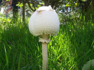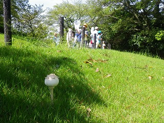 【左】キノコの説明 【中】芝原の茸観察 【右】オオシロカラカサタケ