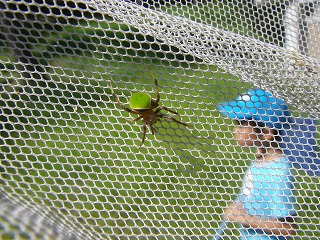 【左】休憩所横の草原で虫探し 【中】何クモかな? サツマノミダマシ 【右】ハエトリグモ