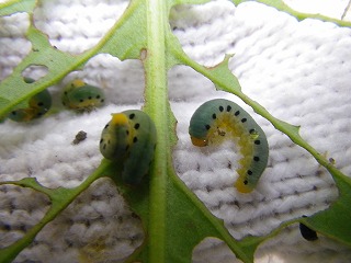 【左】葉っぱが虫に食われていました 【中】犯人はこれだ!! ハグロハバチ幼虫 【右】採集した昆虫の説明
