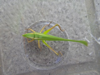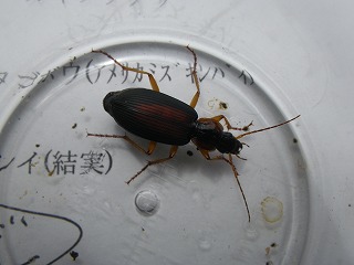 【左】葉っぱ手裏剣作りの続き 【中】セアカヒラタゴミムシ 【右】コバネイナゴ