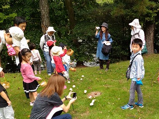 はじめに管理協会の方から公園の諸注意があり、続いて降幡さんからキノコ全般の注意とつくりについてのお話をした。キノコを拡大した図で説明するので分かりやすく、参加者の小さい子までが、熱心に聞き入った。