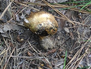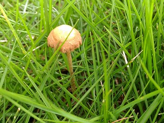 【左】 芝生の中に大きなキノコ発見 【右】 土の中から出ているよ