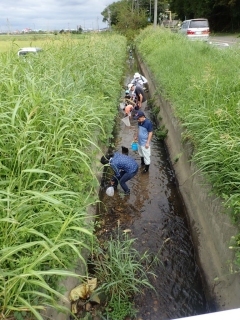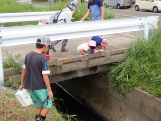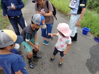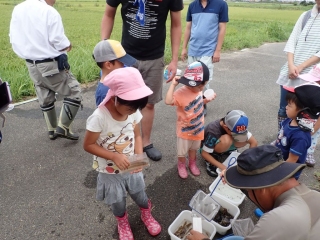 出発直後には、スクミリンゴガイの卵塊の観察、ドジョウの捕獲など、はやくも子供たちが夢中に!