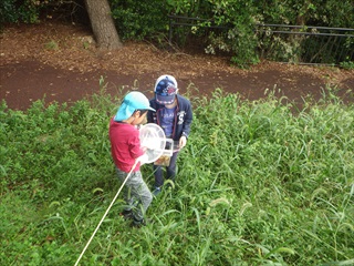 【左】始めのあいさつとお話 【右】子どもはバッタがいれば大喜び。でも、余りいなかった