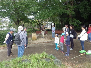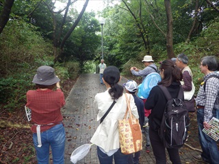 集合場所の駐車場の下(西側)の法面にあった巨木を含む木々が公園整備工事の関係ですべて伐採されていた。その工事の関係で駐車場の下の観察コースは立入不可(案内板によると"再来年"の初夏には新しい公園に生まれ変わる)。そこを省いて公園内の例年のコースを進む。