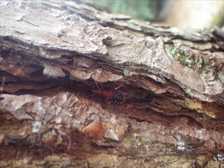 【左】虫たちがケンカしないよう工夫して入れる 【中】松の皮の割れ目にヨコヅナサシガメ