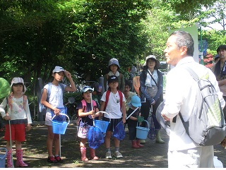 最初に、たもの使い方の説明や諸注意があり、それから、於大公園第一駐車場から歩いて橋に向かいました。川の水はきれいで、水量もてごろ、橋の下に瀬があって川は観察会にはとてもよい状態でした。