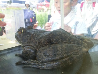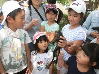 貴重なウナギは今年も見つかりました。大きなウシガエルにびっくり、さわったり持ったりで、また、びっくり。ウシガエルは意外におとなしくしていました。みんなで頑張って、たくさんの生き物を採取することができました。 (記:岩本)