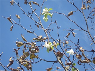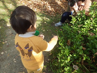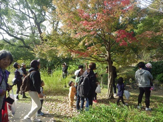 観察会は、工作に使う材料集めからスタートです。どんぐり、木の実や松ぼっくりを拾いました。ホオノキの大きな葉に顔が隠れると喜んだり、モミジの紅葉が赤か ら青まであることを楽しんだり、奥まった秋を楽しみました。ムクロジの実もたくさんなっていました。