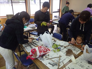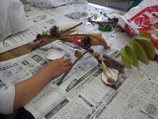 木の実や葉を拾った後は、いよいよ工作です。部屋の中での作成です。木の枝を組み合わせて台にした上に思い思いに木の実をホッとボンドでつけて、リースや飾りにしていました。