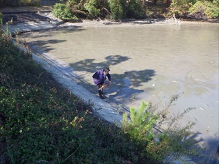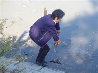 【左】干上がりかけの池で死にそうなコイを見る指導員 【中・右】まだ生きているコイを救助する指導員