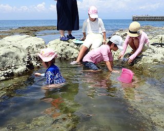 【左】親子で協力して生き物を探します 【右】あまりの暑さに潮だまりに浸かる子も