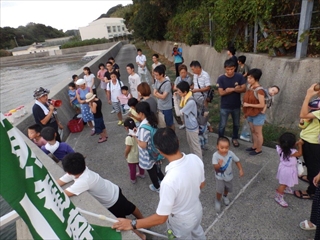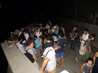 ウミホタルの発光を見るためには刺激が必要なため、ウミホタルの入ったバケツからウミホタルを網ですくい刺激を与えると、真っ暗な中でウミホタルが青白く光りました。その青白く光る様子に参加者からは歓声が上がっていました。