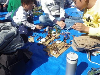 工作材料は、観察会側が用意したドングリ各種、クルミ、松ボックリ、ツバキ、ムクロジ、モミジバフウ等に加え、工作の前に自然公園を散策して集めたツバキの実やヤツデ、アジサイ、モミジなどの葉も加わって、たくさんの種類の材料が揃いました。