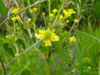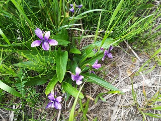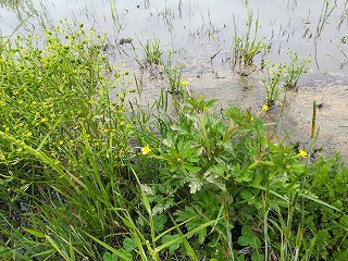 【左】タガラシとキツネノボタン (有毒) 混在していました 【中】スミレが沢山開花しています 【右】水田脇にセリがいっぱい生えていました