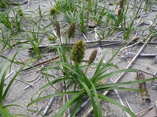 【左】コウボウムキ(雌花) 【中】コウボウムギ(雄花) 【右】スナビキソウ