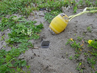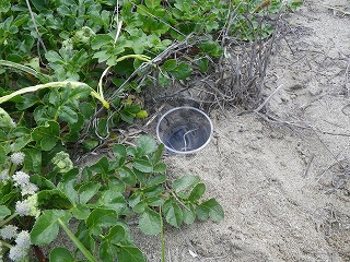 【左】昆虫採集トラップと目印 【右】大量に捕れたスナゴミムシダマシの仲間