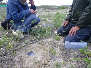 【左】発芽したオニグルミ掘り起こし 【中】昆虫採集トラップ 【右】昆虫採集トラップ