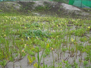 【左】小雨に煙る蒲池海岸 【右】小雨の下、コマツヨイグサが蛍光色で目立つ