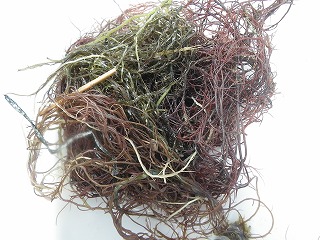 【左】漂着海藻 ミル 【中】漂着海藻 アナアオサ 【右】イタヤガイ(貝殻)