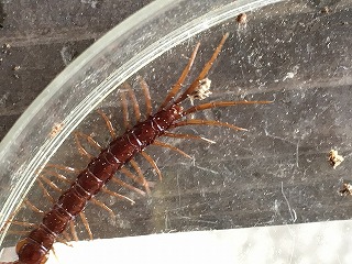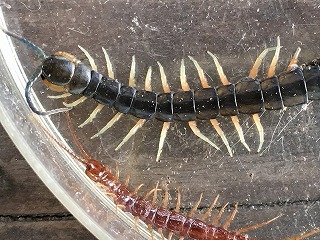 【左】キマワリの幼虫に冬虫夏草が取り付いた   【中】イシムカデ      【右】アオズムカデ