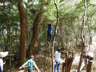 【左】ツタの木を登る 【中】竹切り体験…※ 次回から正式メニューに 【右】竹渡り