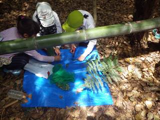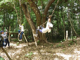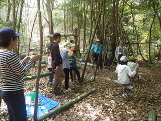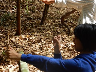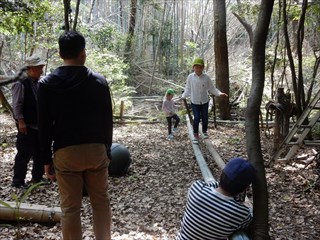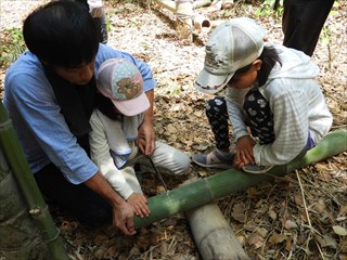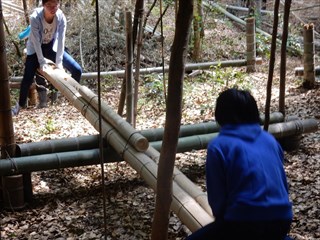 傷んだ竹を交換した遊具や藤蔓、ターザンロープ、正躬先生の用意したパチンコ等で遊びました。