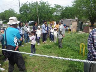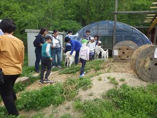 前日に、子ヤギが産まれて見学してもらい、おやつのわらび餅をヤギにあげる体験をして、わずかに残っていたサクランボの味見をしてから、竹林に入りました。