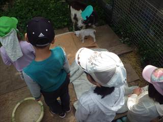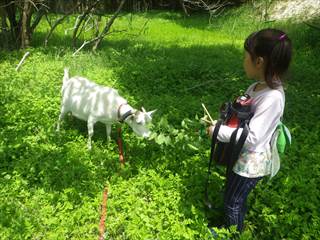 【左】はじめは、ヤギさんとふれあう 【右】次は林内で、ターザンロープ遊び