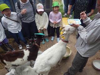 【左】昨日、生まれたばかりの赤ちゃんを見学 【中】おとなのヤギは"ワラビもち"が大好き 【右】クワの葉も大好き