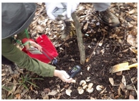 観察会の目的である朽木や朽ちた立木の根元をドライバ−や小型スコップで探りながら観察をしたがなかなか見つからない。始めのクヌギの朽木にヒゲジロハサミムシのメスが居て、男の子がオスがほしいと言われたのにはびっくり!・・昆虫に対する興味深い子が居た。