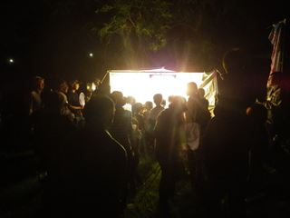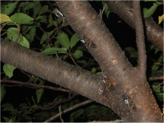 誘蛾灯設置のスクリーンに集まった虫の種類はカブトやクワガタ、大型の蛾も来て無く、見せ場に欠けたが、子どもたちは非常に喜んでいたので、これはこれで"よかった"と言うことになる。 なお、ナイトハイクは参加者を3班に分け、班ごとにハイクするが、「見つけても採らない」で見るだけと言う約束で出発した。そのため、冒頭の"最大の見せ場"のカブトやクワガタを、それぞれの班は、到着時刻は違うが、同じ状態の現場を見ることになる。
