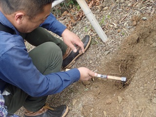 自然環境学習の森の駐車場から新池(ため池)を通りながらゆっくりと散策を行い、ワラビの出るやぶへ。ノイバラのとげにきずつけられながらも、「人生はじめてとった!!」といった声も聞かれ、皆さん熱中してやぶでしゃがみこんでワラビの目になります。夜のおかず用にと、セイタカアワダチソウやヨモギの新芽を積んだり、セリを積みながら進みます。