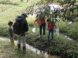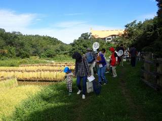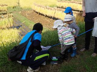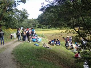 10月に入っても台風の影響を受け、関東・長野地方は河川の決壊により大きな被害を受けた今年。昨日は一日雨で天気が心配されたが、今日は秋晴れとなり、日向に出るとまだまだ日差しがきつく暑い日であった。今日は、虫網をもったたくさんの親子、日本エコロジスト協会の生き物調査の若者たちが参加した。